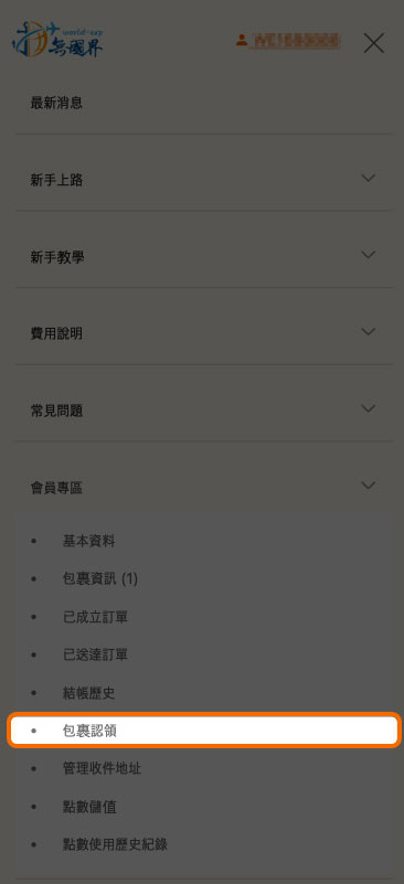STEP 1. 登入無國界官網後點擊 「會員專區」 > 「包裹認領」。